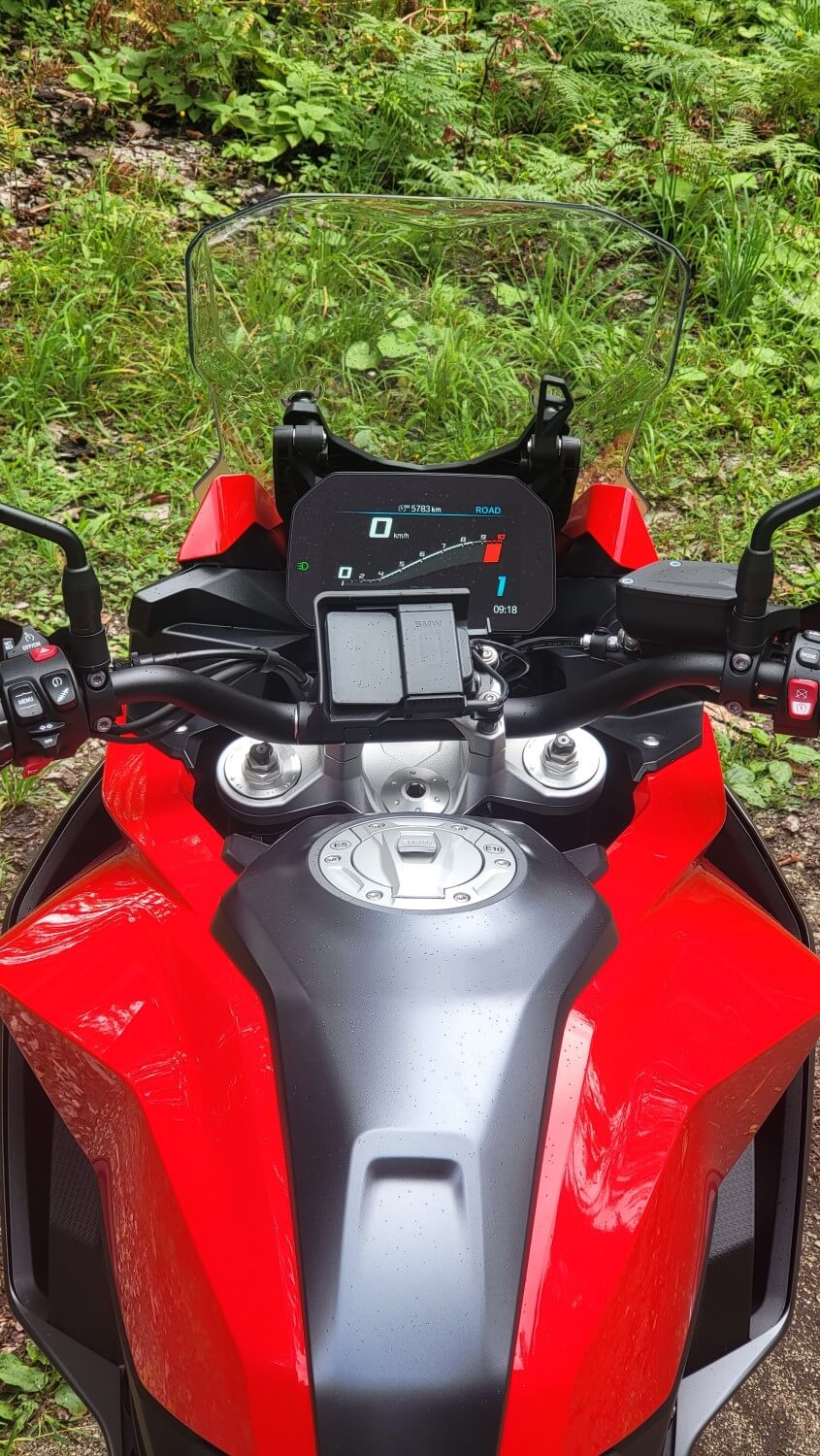 Seveda levo nogo k prestavljanju vabi »kvikšifter«, ki je tudi tu, logično, na trši strani. Zaradi položaja sedenja je občutek manj agresiven kot na R, a vseeno dovolj nagnjen naprej, da ga ne morete zamenjati za enduro motocikel. Med ovinki se mi je zdelo, da je tudi nekoliko mehkejši od »nagca«, delovanje elektronsko nastavljivega zadnjega blažilnika je opazno in pomaga pri hitrejši vožnji. Prijetno sem presenečen nad delovanjem motorja, saj se tudi v previsoki prestavi ne pritožuje, ampak nizke obrate prebavlja mehko, brez cukanja. Zbudi se pri nekje 2500 vrtljajih, polni potencial pa pokaže nad 6500 vrtljaji. Na testu je porabil nekje 4,5 litra goriva na 100 km, kar je zadostovalo za udoben doseg blizu 300 km.