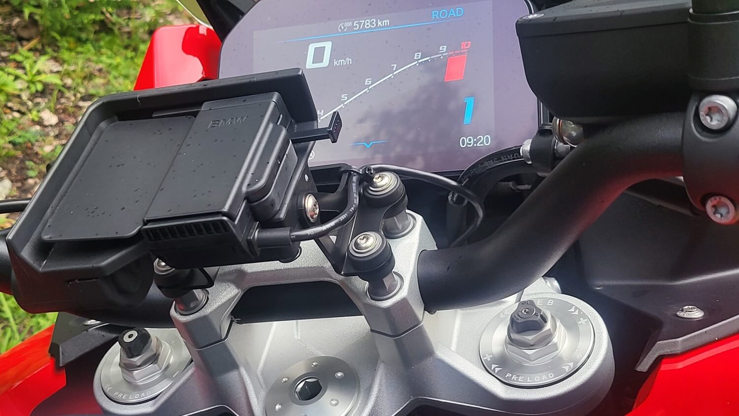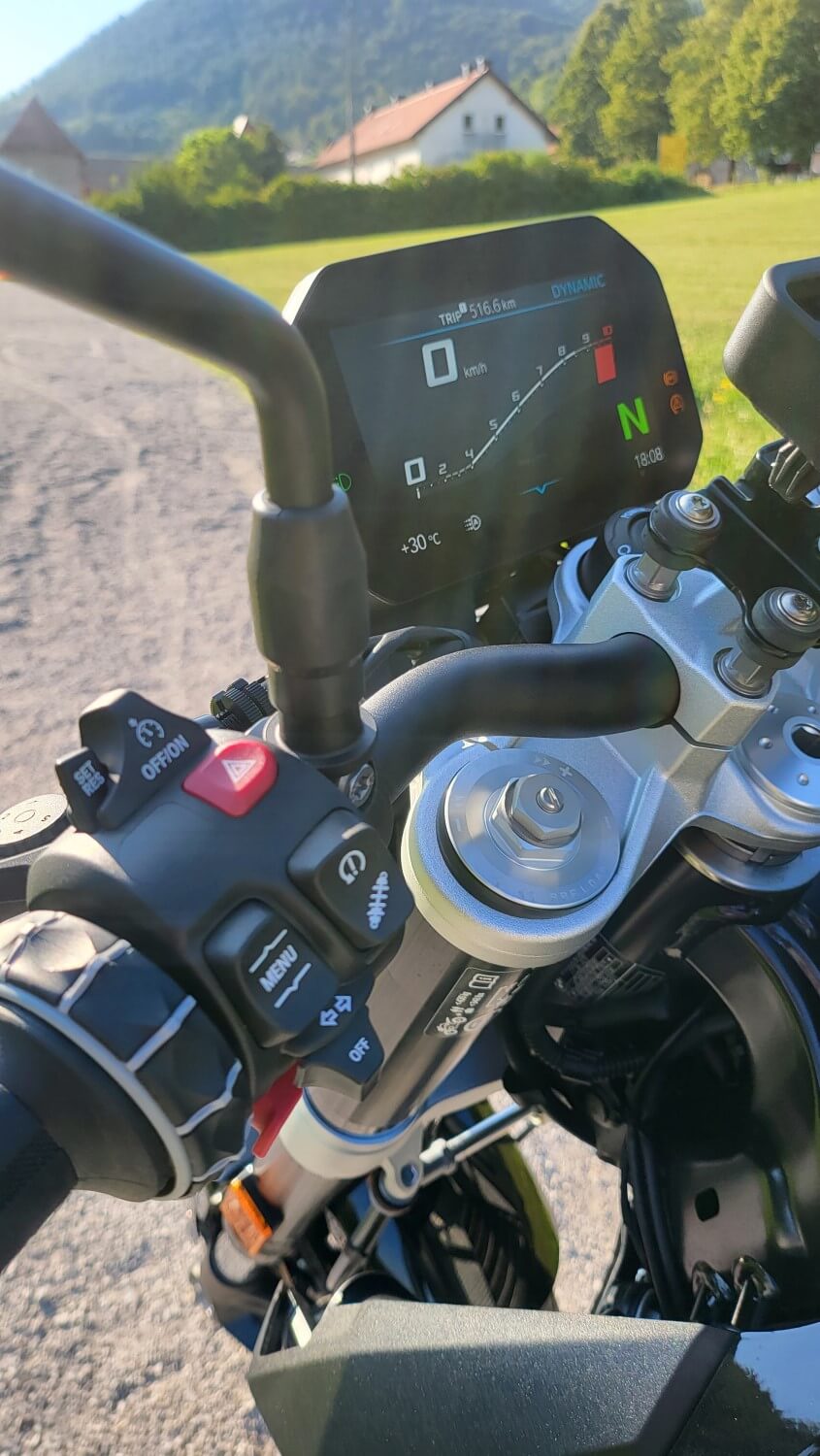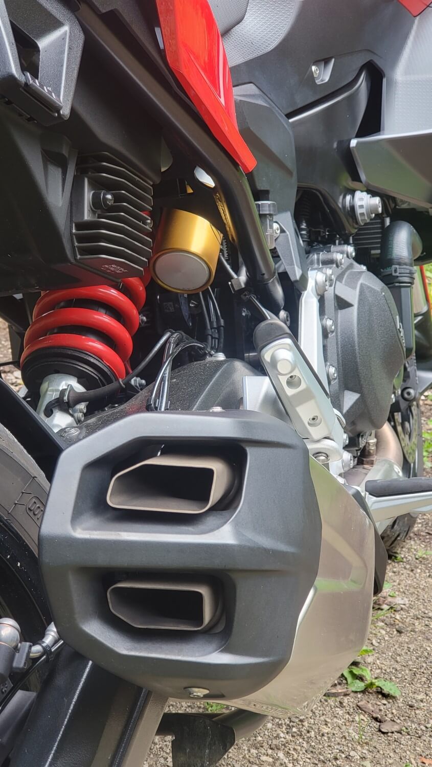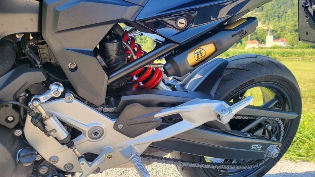 Vzmetenje je povsem novo, na testnem motociklu tudi elektronsko nastavljivo zadaj, sprednje vilice pa si sedaj lahko nastavite ročno. Prednjih vilic nisem tikal, sem pa preklapljal med nastavitvami zadnjega blažilnika, možnosti Dynamic in Comfort, ko sem križaril ob Krki. Je opazno in kako ob višjem tempu opazim, da zadnji konec postaja nemiren v običajnem načinu, ga je Sport lepo popravil nazaj v tirnice. Vozil sem pa sem se sam tako, da vam ne morem poročati kako se zadeva obnaša pri polni obtežitvi.