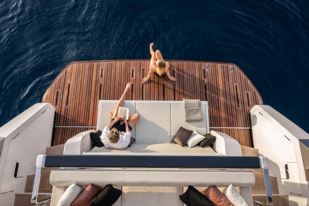 Krmni del je eden najbolj prepričljivih elementov jahte. Velika tikova krmna ploščad s površino več kot 7 m² deluje kot prava zasebna plaža, dodatno pa jo oplemeniti elegantna steklena ograja, ki omogoča pogled na morje. Krmni kokpit meri približno 15 m², zastekljeni zadnji del pa vizualno odpre prostor in ga poveže s ploščadjo. Posebej velja izpostaviti dobro rešeno ločevanje poti posadke in gostov. Vhod v prostore za posadko je prestavljen na levi bok in je diskreten, kar pomeni, da posadka lahko opravlja svoje naloge brez poseganja v prostore za goste. Pod stopnicami na poveljniški mostiček so nameščeni prostori posadke s tremi kabinami, kopalnico in WC-jem, dostop do strojnice pa je možen tudi iz tega dela. Preizkušeni primerek je imel dodatno še tretje krmilno mesto v kokpitu (opcijsko), kar olajša manevriranje pri pristajanju.