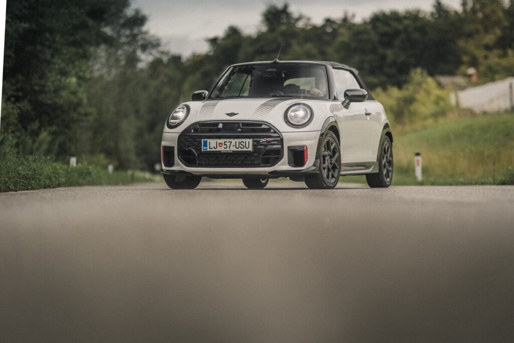 Ne vem kako, a Mini Coperju nekako uspeva, da je škatla (govorim oblikovno, ne kakovostno), da ima voznik znotraj občutek, kot da je v škatli, a obenem deluje tako seksi in tako fokusirano, da vsakič znova preseneti. Zaradi hudo pokončnega in naprej pomaknjenega vetrobranskega stekla, pa velikih oken in miniature armaturne plošče je tudi občutek prostornosti in zračnosti za tako mali avto, presenetljiv. Da, notri je precej trde plastike, a ti hudič, sploh ne zmoti. Kajti….vas zmotita gola pločevina in jeklena kletka v dirkalnem avtomobilu? Ker je avtomobil, govorim seveda o JCW izvedbi, tako dobro in kompaktno sestavljen, obenem pa tako fokusiran na vožnjo, trda plastika ne zmoti niti malo.