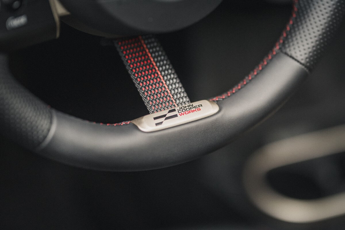 Ne vem kako, a Mini Coperju nekako uspeva, da je škatla (govorim oblikovno, ne kakovostno), da ima voznik znotraj občutek, kot da je v škatli, a obenem deluje tako seksi in tako fokusirano, da vsakič znova preseneti. Zaradi hudo pokončnega in naprej pomaknjenega vetrobranskega stekla, pa velikih oken in miniature armaturne plošče je tudi občutek prostornosti in zračnosti za tako mali avto, presenetljiv. Da, notri je precej trde plastike, a ti hudič, sploh ne zmoti. Kajti….vas zmotita gola pločevina in jeklena kletka v dirkalnem avtomobilu? Ker je avtomobil, govorim seveda o JCW izvedbi, tako dobro in kompaktno sestavljen, obenem pa tako fokusiran na vožnjo, trda plastika ne zmoti niti malo.