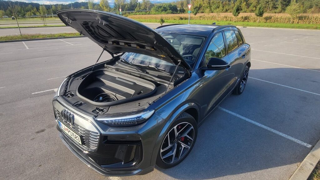 Q6 e-tron, je lep in skladen avtomobil. Ravno prav zašiljen, ravno prav zmehčan po robovih, da izgleda tako moderno športen kot prijetno družinski. Kljub temu, da je testni primerek opremljen z nepogrešljivim športnim S-line paketom, ki je dodal agresivnejše poudarke in večja platišča, Q6 e-tron ne bode v oči. Opisal bi ga celo kot elegantnega, je opazen, a ni žaljiv. Velike pohvale oblikovalcem z moje strani. V notranjosti so oblike nekoliko bolj ostre in futuristične, prevladujejo zasloni. 2 velika, usmerjena k vozniku in eden, za doplačilo, pred sovoznikom. Mislim, da je kabina v Q6 e-tronu, poleg tega, da je udobna, tudi estetsko zanimiva in osvežujoče boljša od prostostoječih pokončnih zaslonov, ki dandanes prevladujejo in so izgovor za lenobo (varčevanje) pri oblikovanju v večini avtomobilskih znamk.