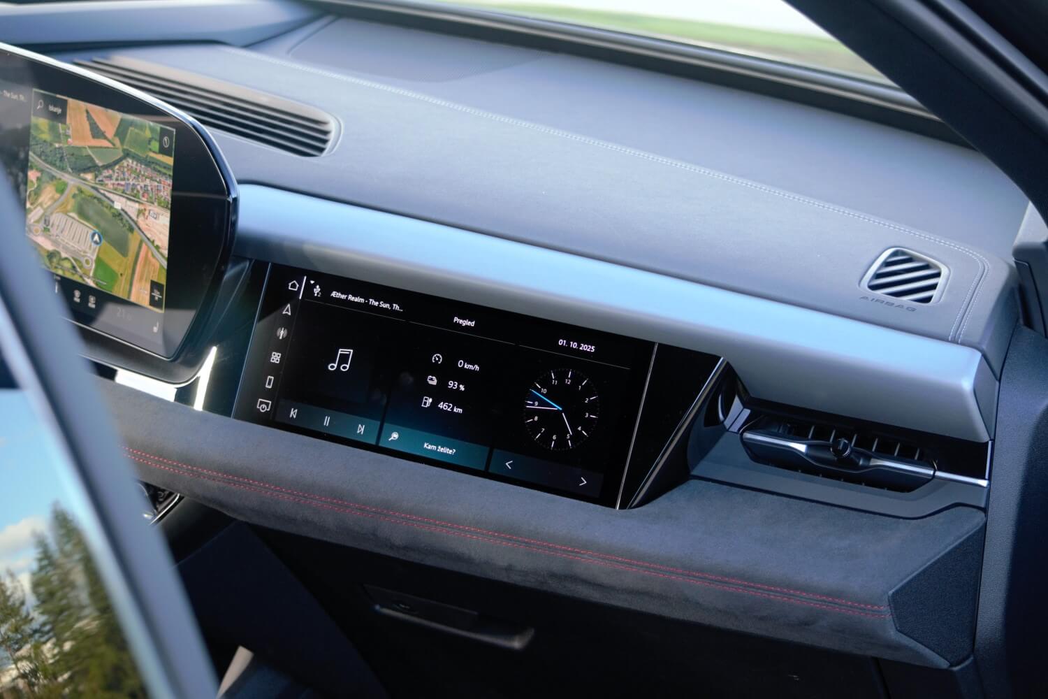 Q6 e-tron, je lep in skladen avtomobil. Ravno prav zašiljen, ravno prav zmehčan po robovih, da izgleda tako moderno športen kot prijetno družinski. Kljub temu, da je testni primerek opremljen z nepogrešljivim športnim S-line paketom, ki je dodal agresivnejše poudarke in večja platišča, Q6 e-tron ne bode v oči. Opisal bi ga celo kot elegantnega, je opazen, a ni žaljiv. Velike pohvale oblikovalcem z moje strani. V notranjosti so oblike nekoliko bolj ostre in futuristične, prevladujejo zasloni. 2 velika, usmerjena k vozniku in eden, za doplačilo, pred sovoznikom. Mislim, da je kabina v Q6 e-tronu, poleg tega, da je udobna, tudi estetsko zanimiva in osvežujoče boljša od prostostoječih pokončnih zaslonov, ki dandanes prevladujejo in so izgovor za lenobo (varčevanje) pri oblikovanju v večini avtomobilskih znamk.